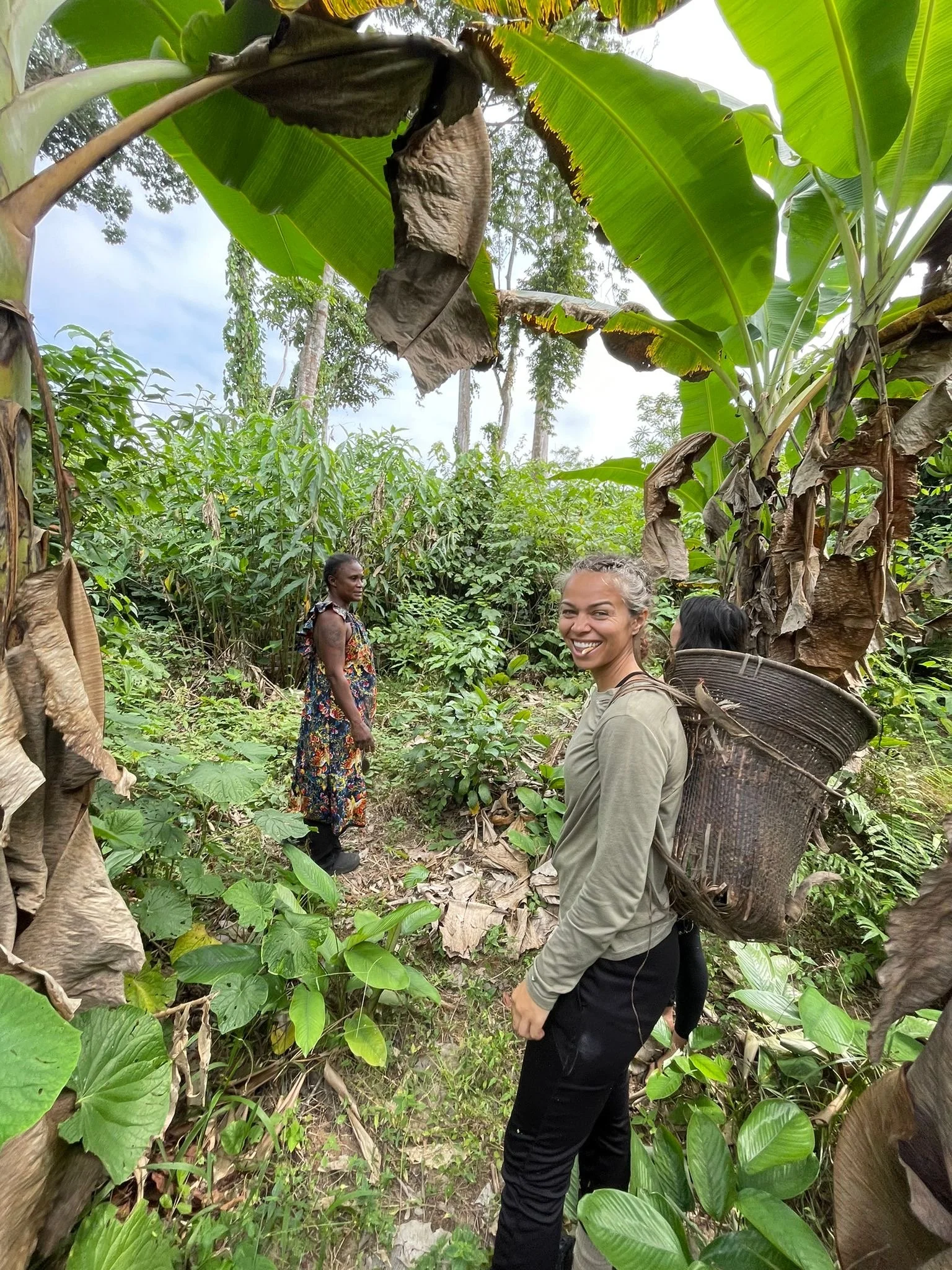 These photographs were taken in a small village near Lambaréné in Gabon. The village is led by a powerful woman, Mama Toto. Due to the lasting effects of French colonialism, many villagers live in modest homes along the roadside. While many own land that includes plantations and natural vegetation, providing food for their families, they face significant challenges accessing it. Without direct pathways, villagers must often hike for hours to reach their land and then carry heavy loads of produce back in traditional baskets called pondzis. When full, these baskets are incredibly heavy, making the journey a physically demanding task that requires strength, endurance and abled bodies.